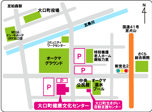 しばらく道なりに国道41号を犬山方面へ直進。国道41号の「新宮二丁目北」交差点を左折してください。後500mほど直進すると左に「大口町健康文化センター」が見えます。